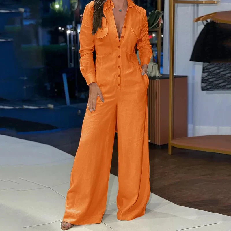 Su cierre frontal con botones agrega un toque clásico y atemporal al look, mientras el corte entallado estiliza la figura y aporta una presencia imponente. Ideal para eventos formales, reuniones laborales o cenas elegantes, el Mono Élitaire transmite autoridad y feminidad de manera única.